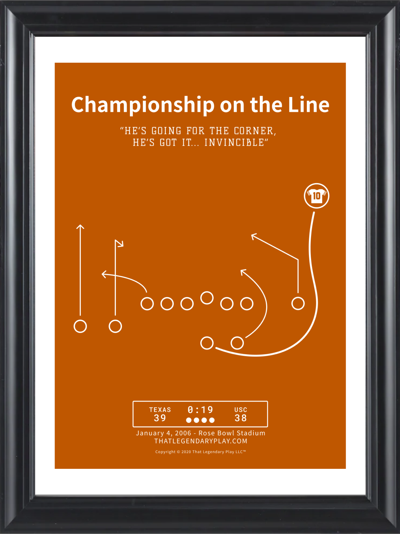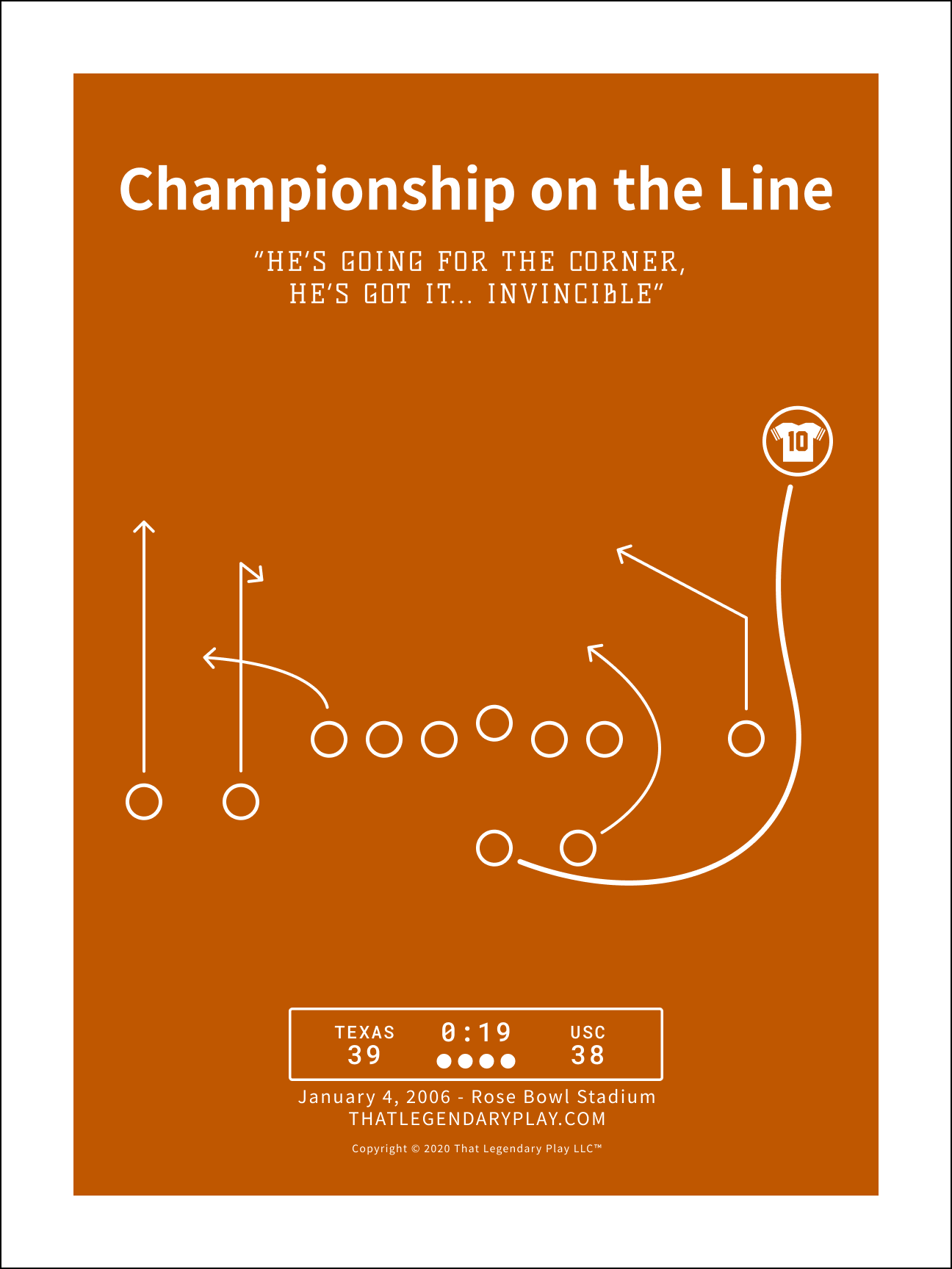 Facing a fourth and five from the 9 yard line, Vince Young received the shotgun snap scanned the field but found his receivers covered. Young took off toward the right sideline and won the footrace to the end zone. That score, Young’s third rushing touchdown of the game, gave the Longhorns a one-point lead with 19 seconds left to play. Texas defeated USC to become the BCS National Champion.