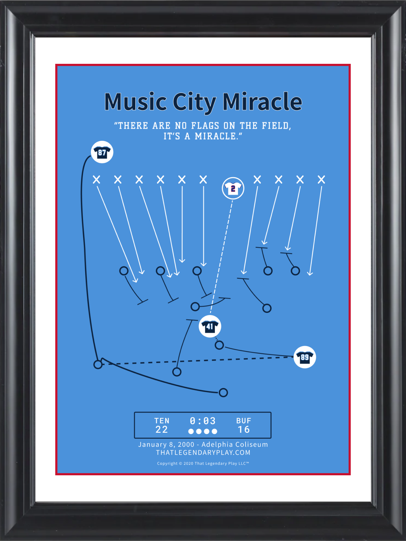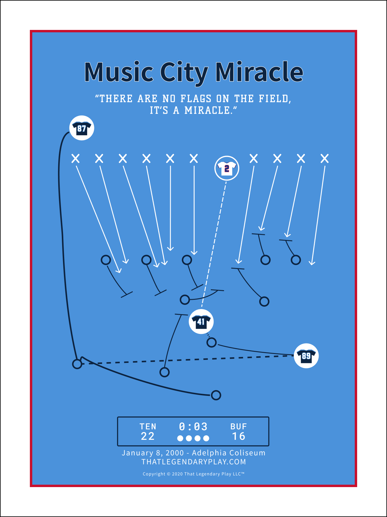 The Tennessee Titans trailed the Buffalo Bills by a point with 16 seconds to play in the AFC Wild Card playoff game. Steve Christie pushed a short kick which was fielded by Lorenzo Neal. Neal instinctively handed the ball to Frank Wycheck, who ran toward the right and threw a lateral across the field to Kevin Dyson, who ran 75 yards to score the winning touchdown for a 22-16 victory. The Music City Miracle is the most iconic play in Titans franchise history, which catapulted the Titans to a spot in the AFC Championship game and ultimately a Super Bowl appearance.