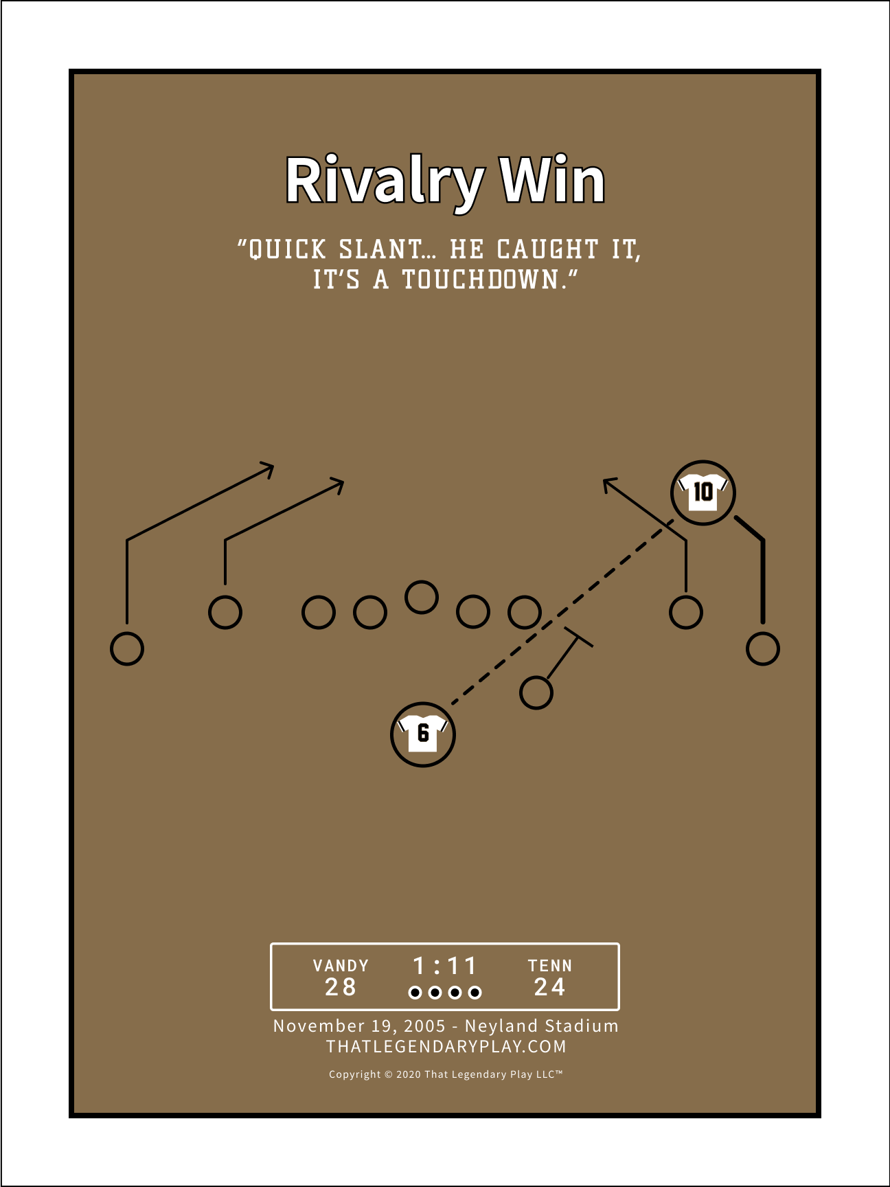 In this rivalry game, Jay Cutler went 27-39 for 315 yards and Earl Bennett had 14 receptions for 167 yards. Bennett’s biggest reception of the afternoon, was a late touchdown catch with 1:11 left to help Vanderbilt snap a 22 game skid versus the Vols.