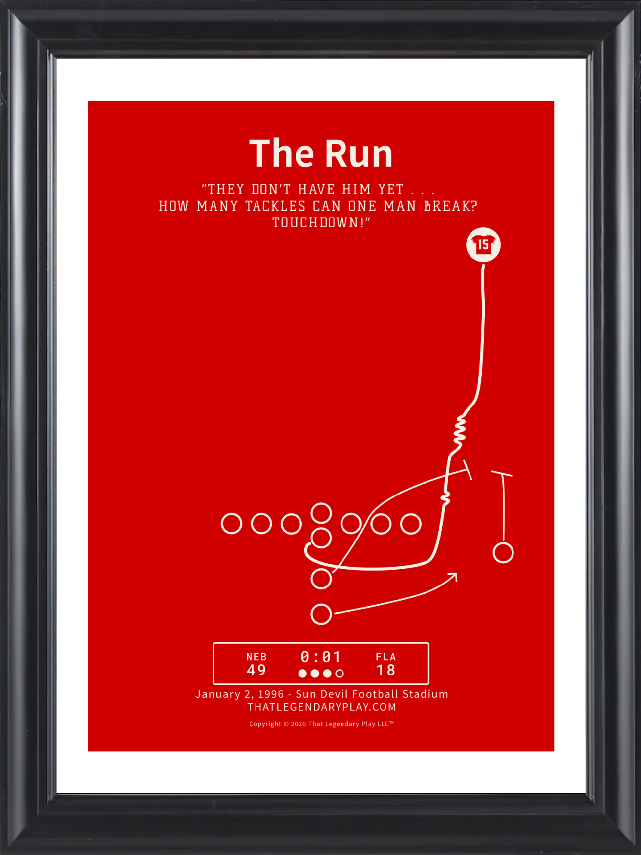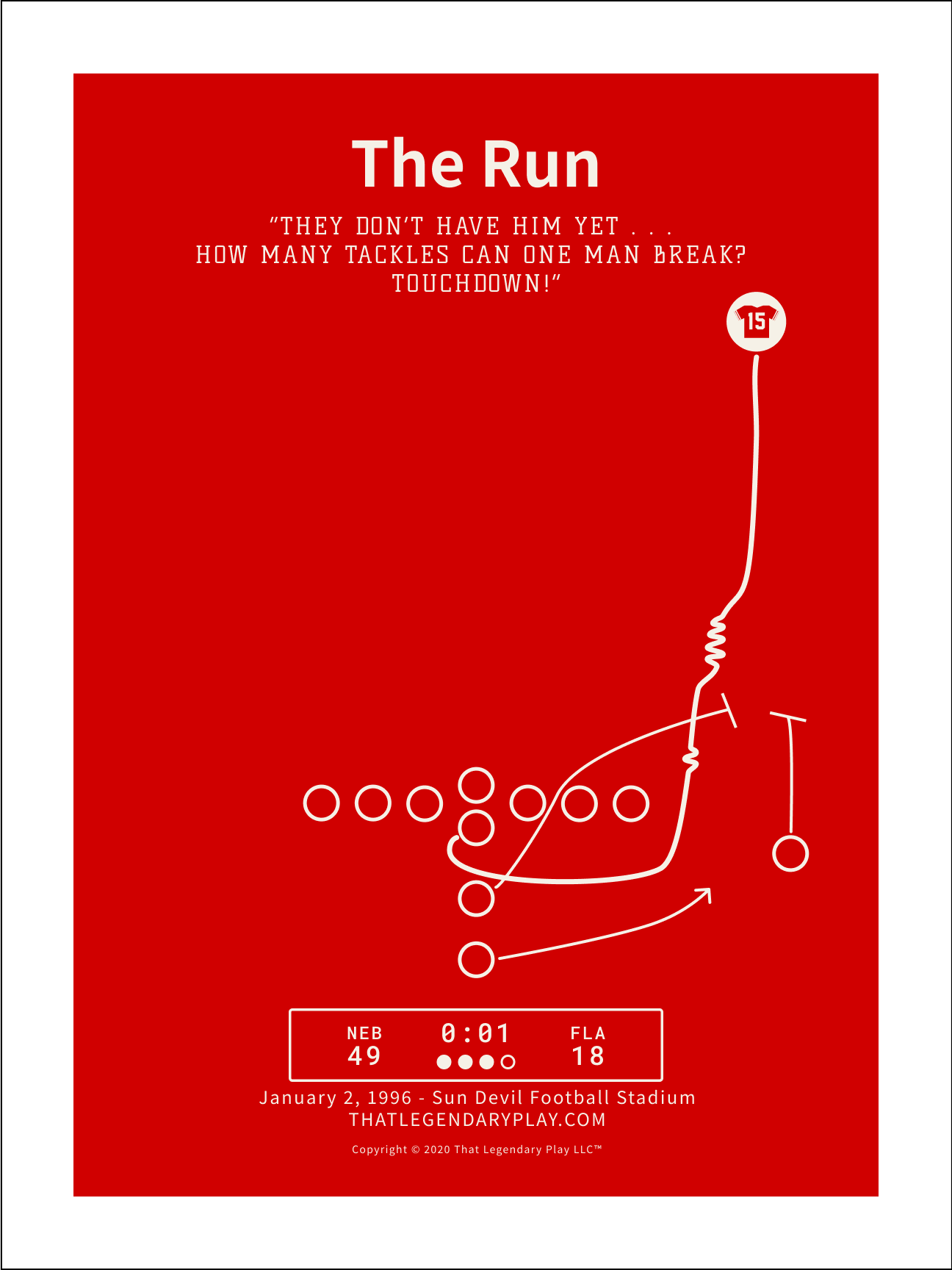 Tommie Frazier ended his college career with one of the best plays in the history of college football history during the 1996 Tostitos Fiesta Bowl that pitted the Nebraska Cornhuskers against the Florida Gators. Frazier ran the triple option to the right side before running into a wall of Gators. Incredibly, he continued to pump his legs and broke free from the defensive players to run for a career high 75 yard touchdown. Frazier ended the game as the National Championship MVP with 16 rushes for 199 yards and two touchdowns. He also completed 6 of 14 passes for 105 yards and a touchdown for a dominant performance over the Gators.