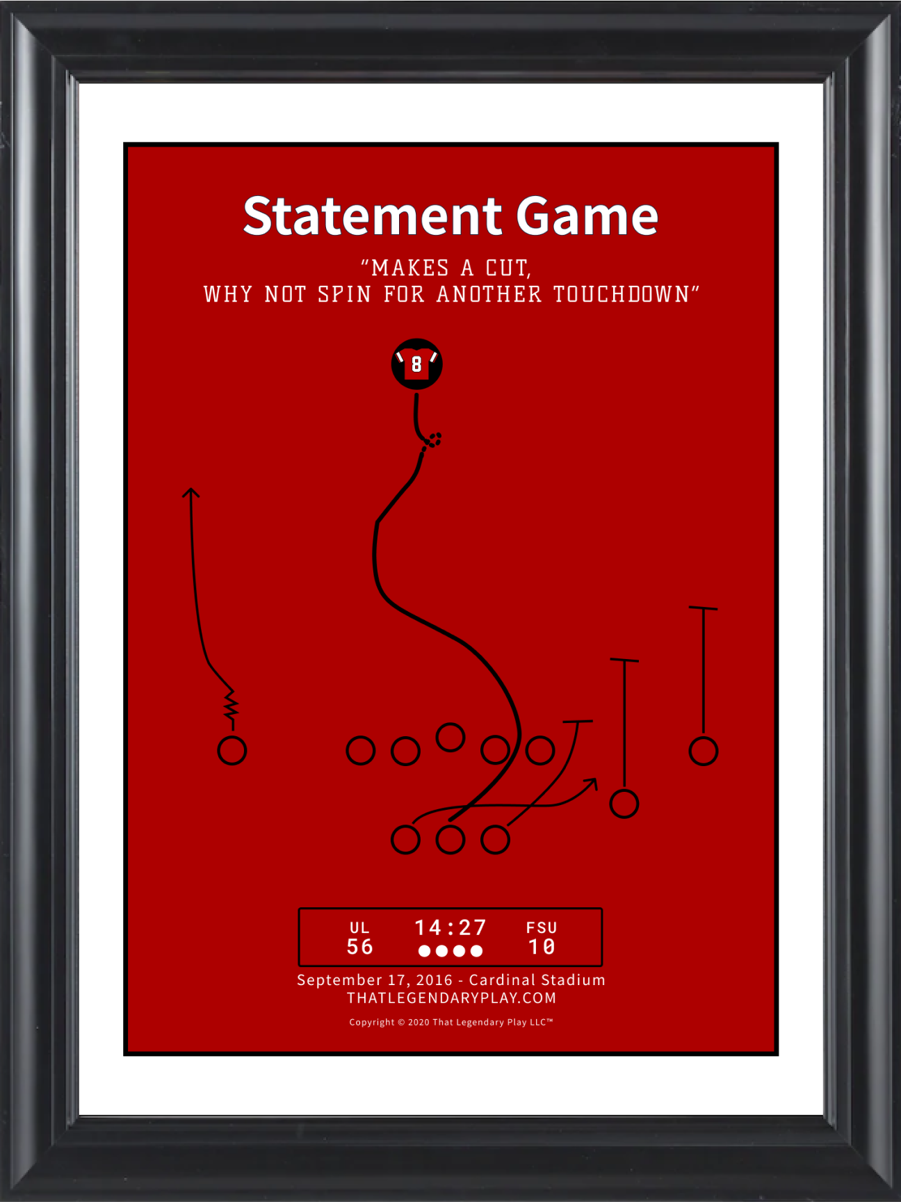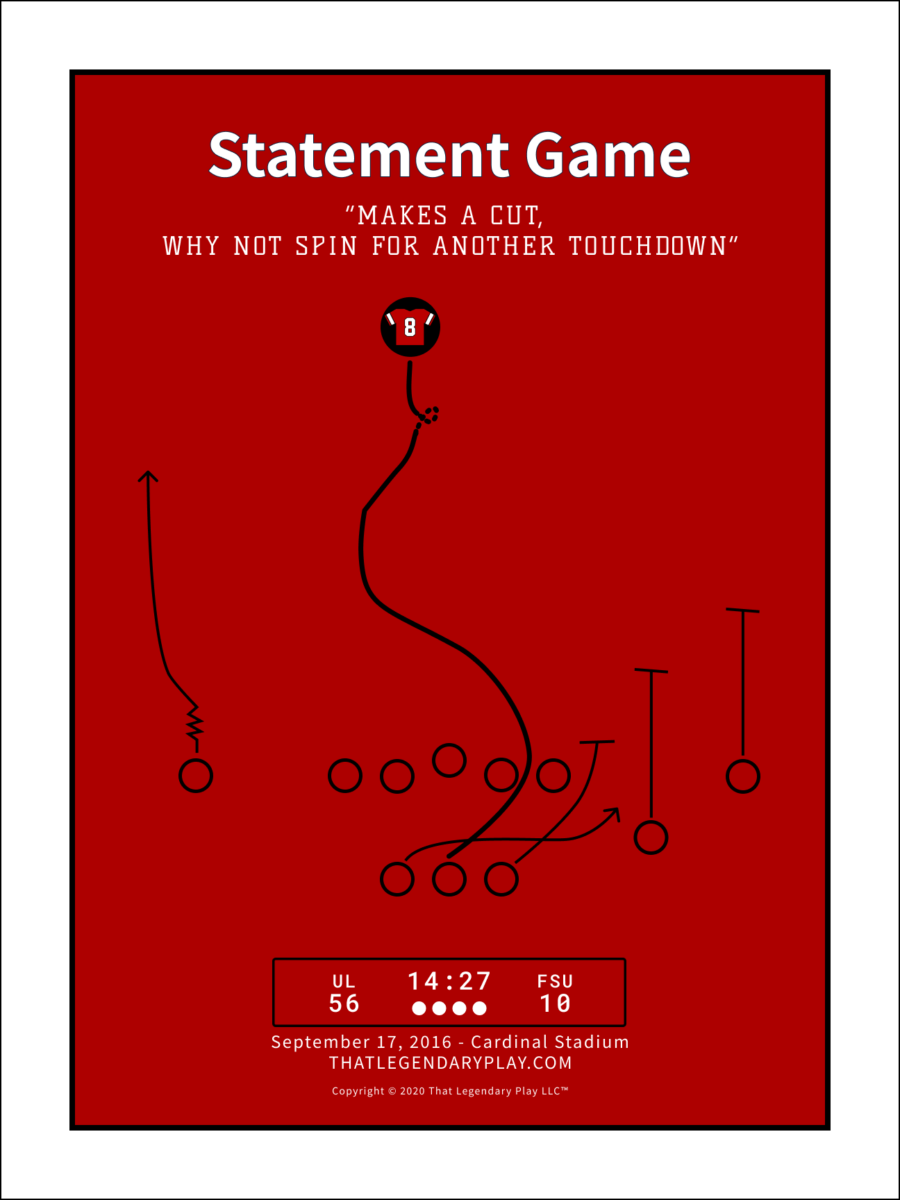 Lamar Jackson ran for 146 yards and four touchdowns, passing for 216 yards and a score as No. 10 Louisville poured it on for a 63-20 victory, dismantling the second ranked Florida State Seminoles in one of the worst defeats in FSU history. Jackson added to his legendary status as he faked one defender and spun off another en route to his final TD run of 47 yards.